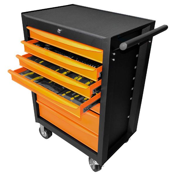 Carro de 7 cajones naranja con herramientas en surtido
